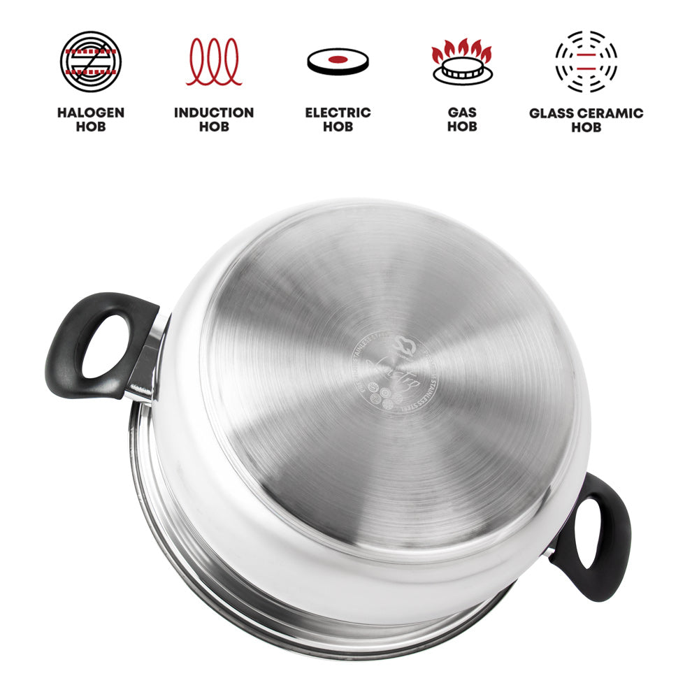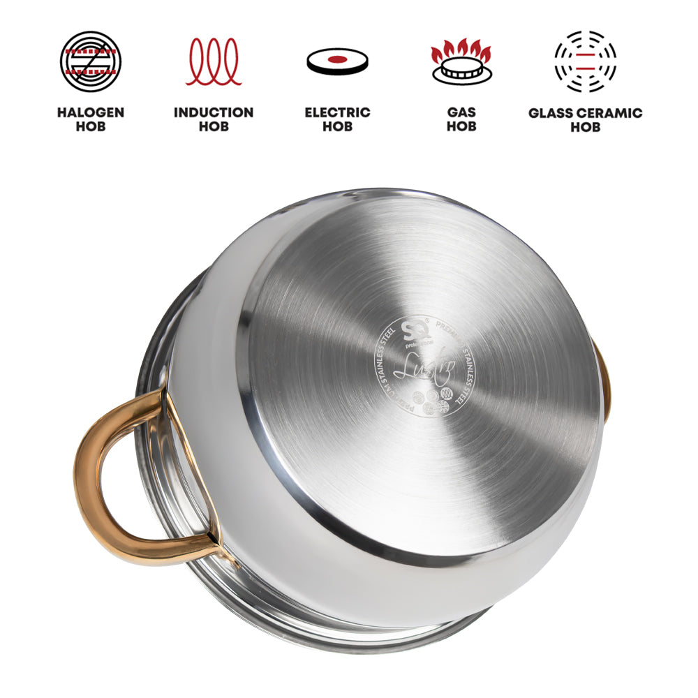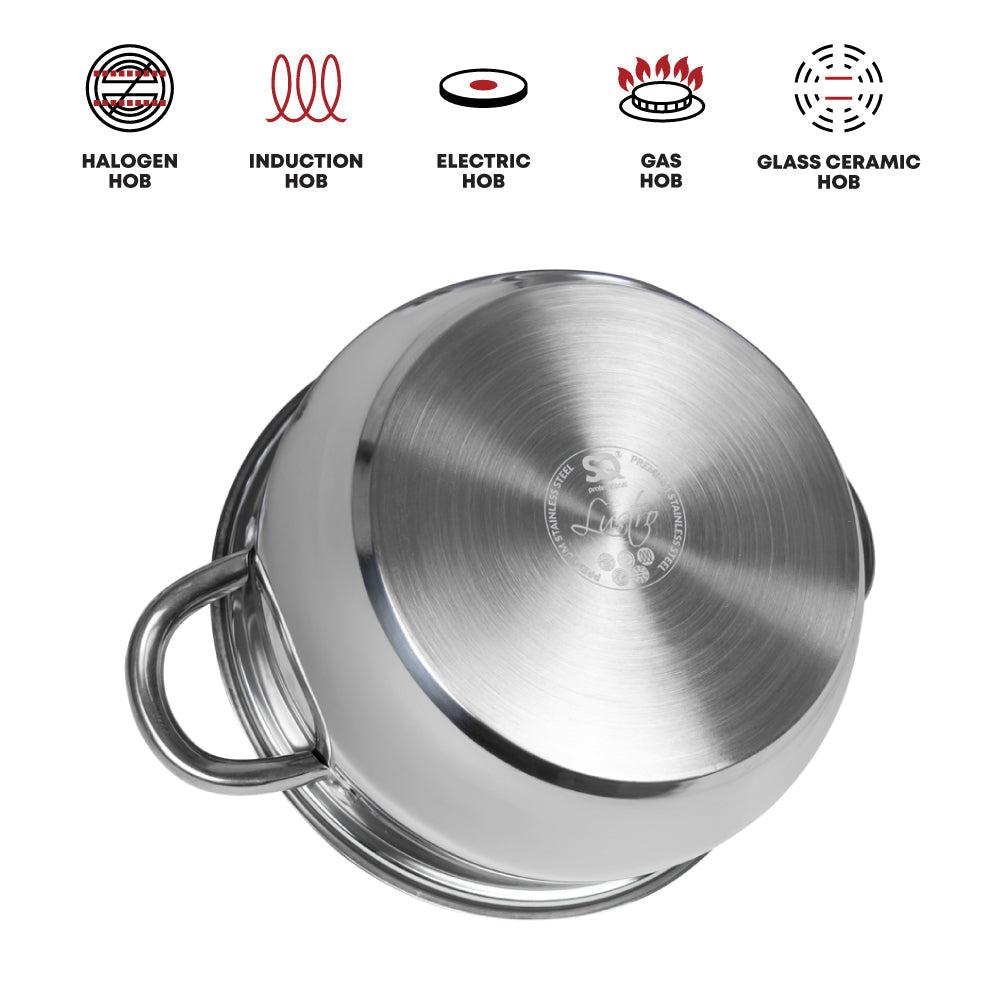 MATERIAL: Each pot in this set is meticulously crafted from high-quality stainless steel, ensuring durability, even heat distribution, and corrosion resistance. The Lustro set is built to withstand the rigours of professional kitchens and the demands of daily home cooking.