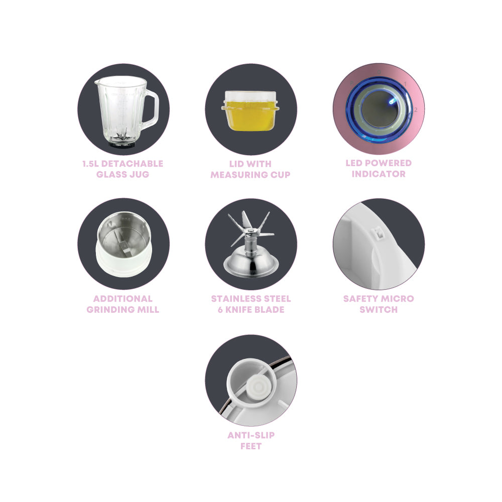 With an all-new design and 500W of power, the powerful SQ Professional Gems Luminate Blender & Grinder brings both grace and quality blending to your set of kitchenware with 2 speeds and pulse settings. It’s time to forget about complicated displays and introduce a stylish & straightforward blender, grinder and mixer that will get the job done!