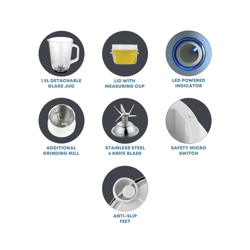 LARGE JAR CAPACITY: Constructed with a stunning, heavy, brushed-steel base, the 1.5-litre glass blender and grinder attachment will enable you to blend huge amounts of Fruits, Vegetables, Coffee, and Spices. SQ Professionals blender will provide a glass of tasty & healthy juice instantly!