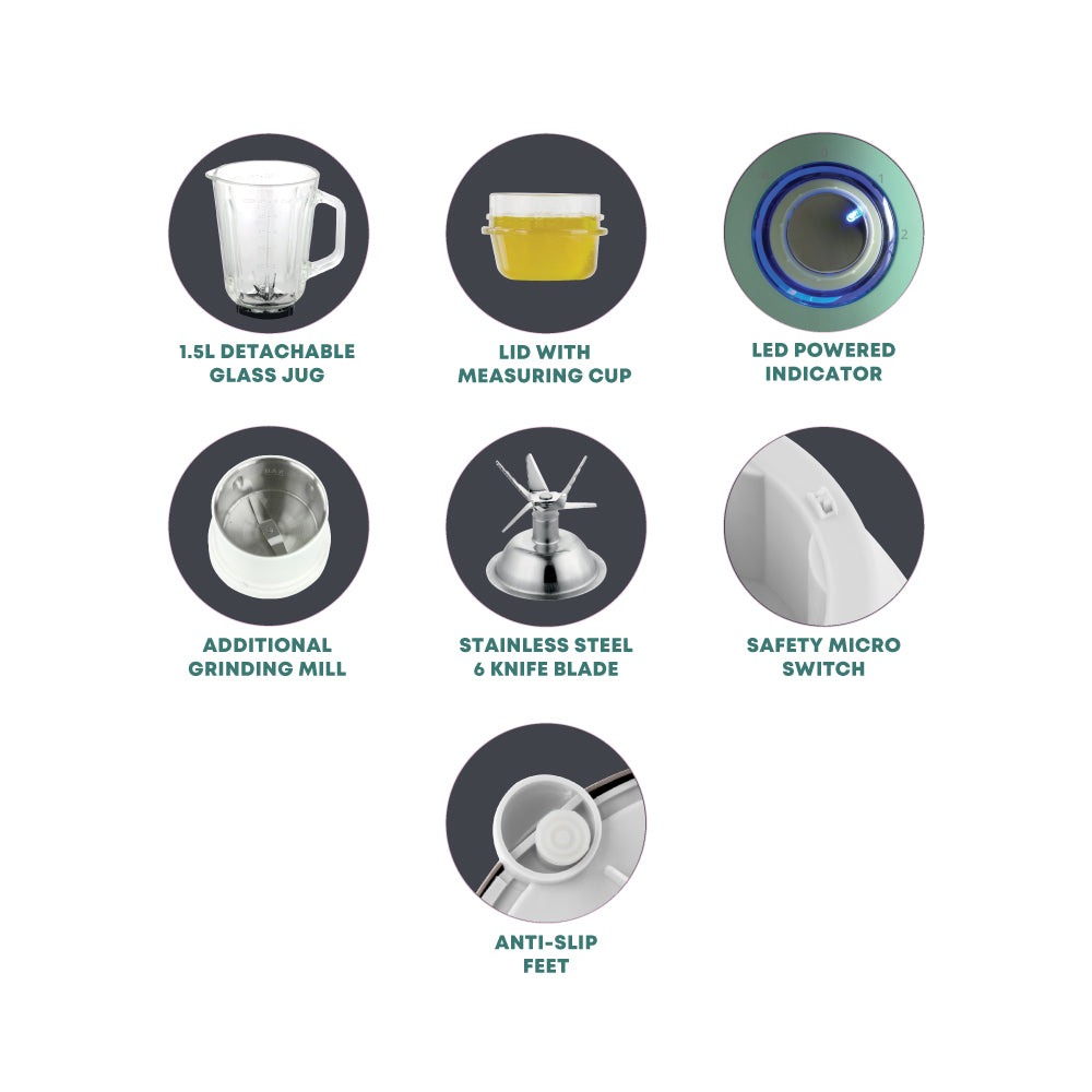 EASY TO CLEAN: Add a touch of fun and colour to your kitchen with this beautifully designed blender, grinder and mixer. Its vibrant look is perfect for every trendsetting kitchenware set. Designed with you in mind, the appliance is easy to clean, with dishwasher-safe removable parts.