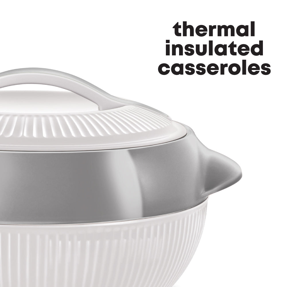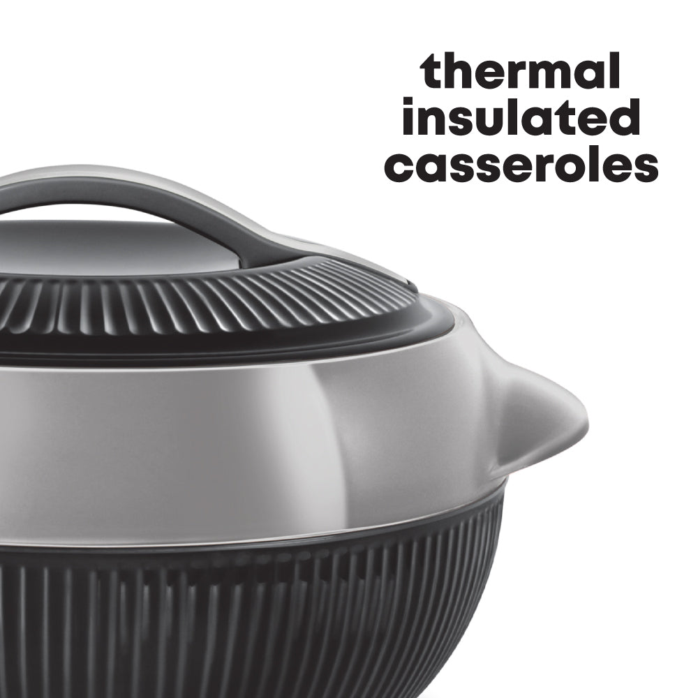 DESIGN: With a sleek and contemporary round design, and stunning white-silver or black-silver finish, these stainless steel insulated casserole pots are the ideal serving dishes for your dining table. Integrated handles to ensure they can be easily transported from surface to surface.