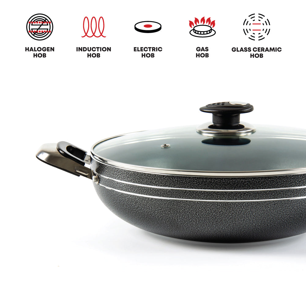 DURABLE: Manufactured from premium thick aluminium, this attractive non stick stir fry pan has been built to last and is ideal for regular use. The aluminium body distributes heat evenly, ensuring that food is cooked thoroughly and avoiding hotspots. The durable tempered glass lid with a steam vent is designed to lock in flavour and retain the full goodness of your cooking ingredients. The strong side handles and a knob complete the elegant design while offering comfort and control during the cooking process.