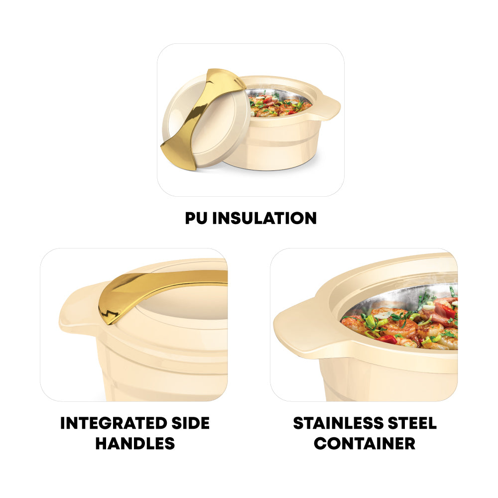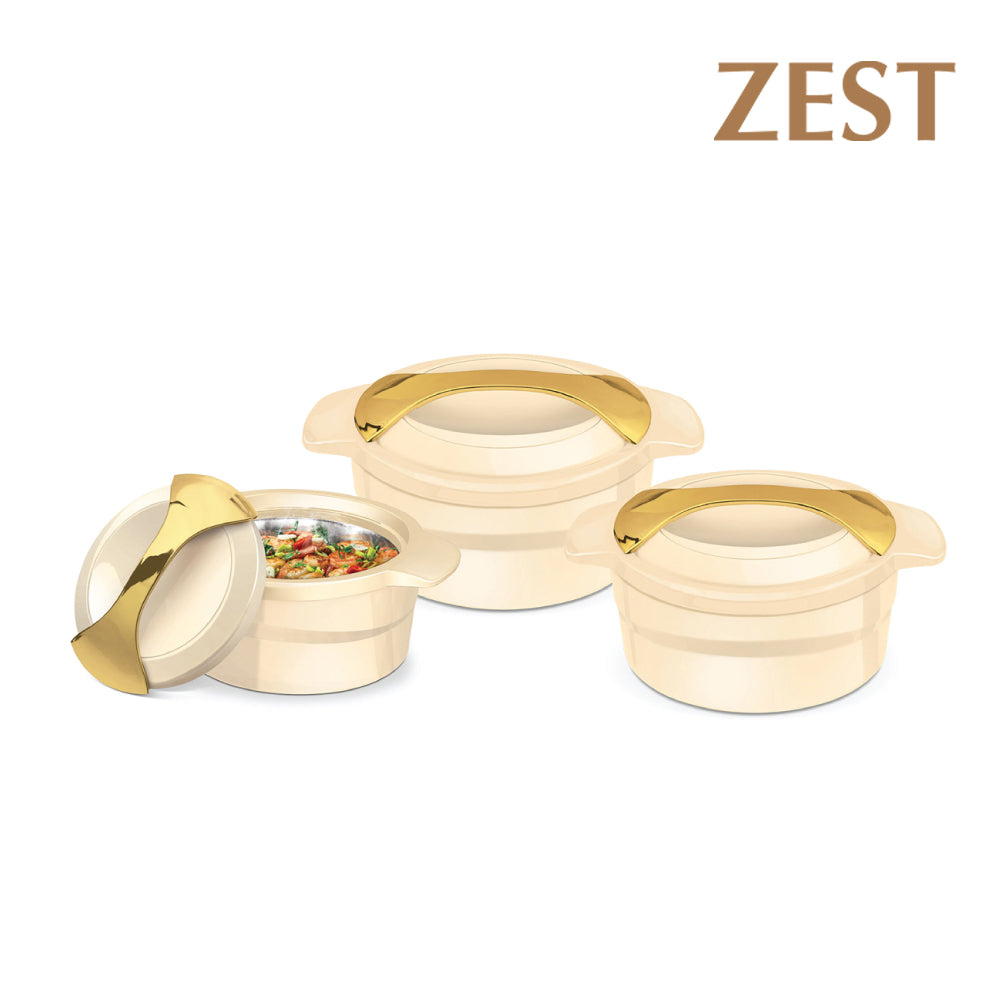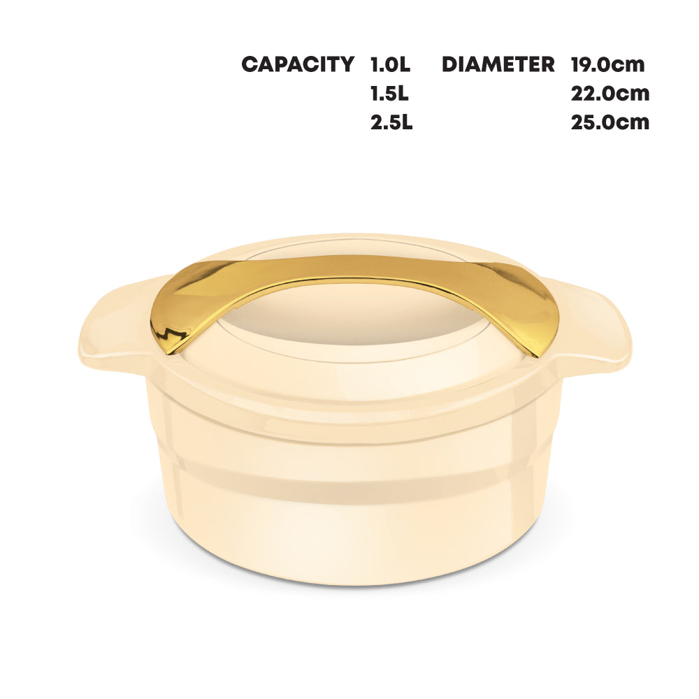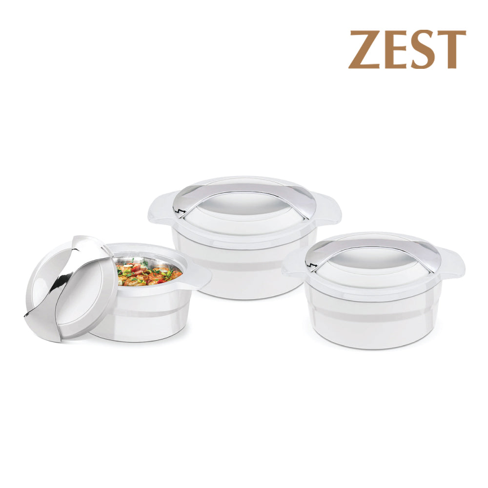 Add a touch of class to your dining experience with the stylishly designed, elegant SQ Professional Zest Insulated 3pc Casserole Set. These Zest premium insulated food warmer pots feature exclusive gold or silver metallic accents that make them perfect for serving food at functions and gatherings or keeping it hot at the dinner table.