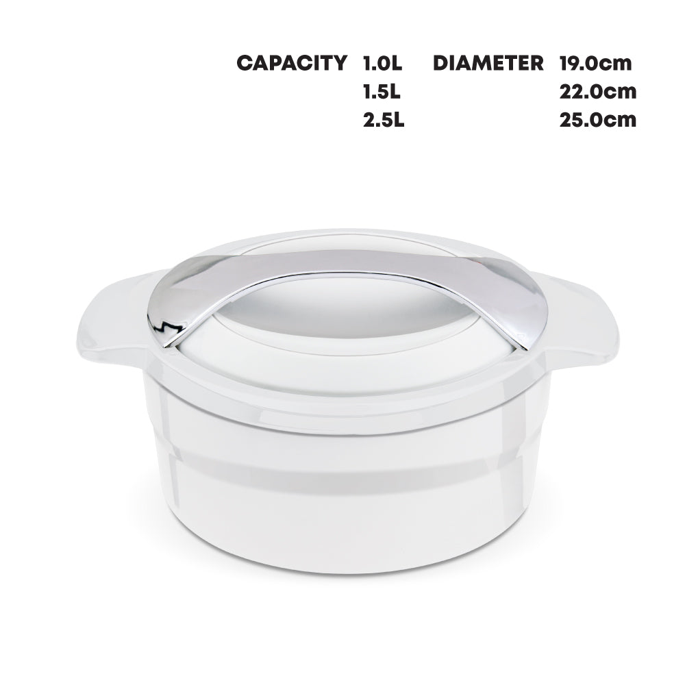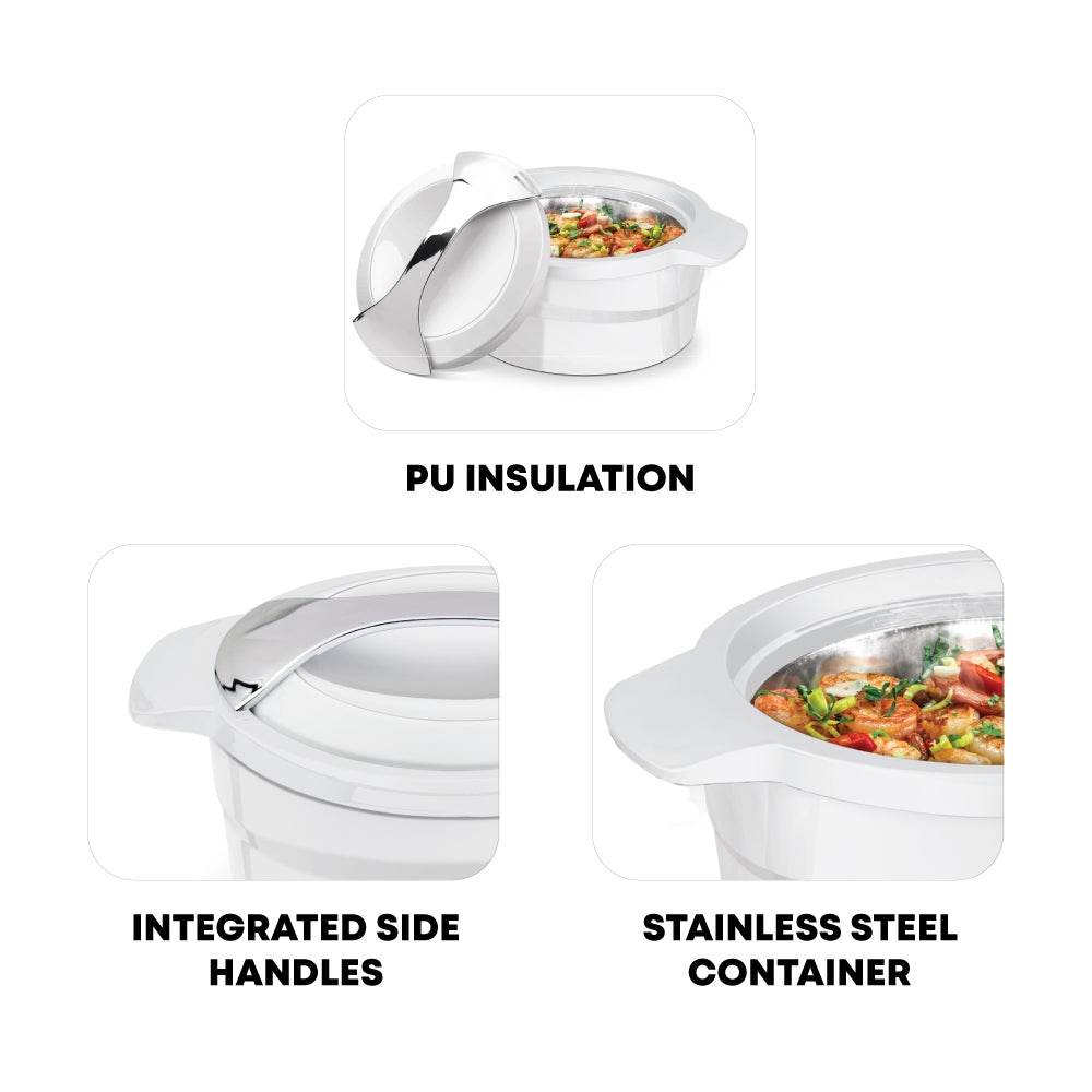 ABOUT THIS SET: This set comprises three insulated casserole food warmers with the following capacities: 1L, 1.5L, and 2.5L.